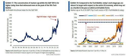 美银警告,随着 AI 技术的快速发展,科技股的估值变得非常高,并可能导致市场集中度过高,从而增加了市场的脆弱性,而特朗普政府可能放松对 AI 的监管、加强出口管制等政策,这将进一步抬升市场的不确定性和风险。