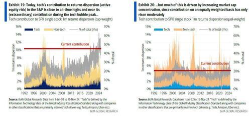 Bowler 团队还指出,美股的创纪录集中导致了活跃风险的历史性集中。如果股票波动性进一步上升,并且集中度增加,随着资产泡沫的膨胀,这将进一步放大管理股票投资组合相对于市值加权基准的挑战。标普 500 指数中,科技股对整体市场回报的波动性(或称风险)贡献了创纪录的水平。