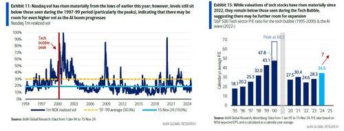 从技术和估值的角度来看,美银认为,今天的波动性和估值表明,科技股比 1998/1999 年更接近 1996/1997 年的状态。