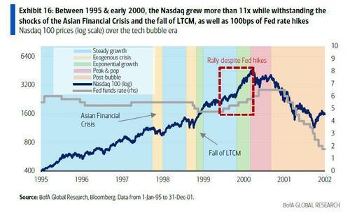 90 年代互联网泡沫的一个显著特点是也对宏观风险的韧性。当时,尽管经历了亚洲金融危机(1997 年)和长期资本管理失败(1998 年)这样的重大宏观危机,以及纳指进入熊市和美联储超过 100 个基点的加息,互联网泡沫依然持续放大。