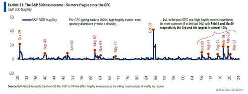 美银在 2016 年的展望中首次提出了市场向更偏峰分布转变的观点,即市场会有更长的平静时期后出现更大的波动。标普 500 指数在近一百年中出现了 4 次最大脆弱性冲击中的 2 次,并且其脆弱性自全球金融危机以来已增加 5 倍。