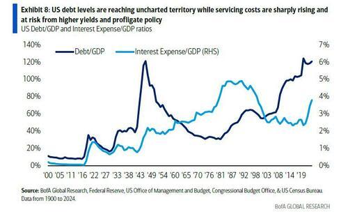 报告指出,美国债务/GDP 今天接近创纪录的 120%,而 1920 年代仅为 30%,甚至超过了二战高峰期。随着宏观不确定性和政策风险更高、更长时间的利率,以及潜在的政策转变风险更高的预算赤字(更高的债务服务成本放大赤字),风险是债券市场会反击。