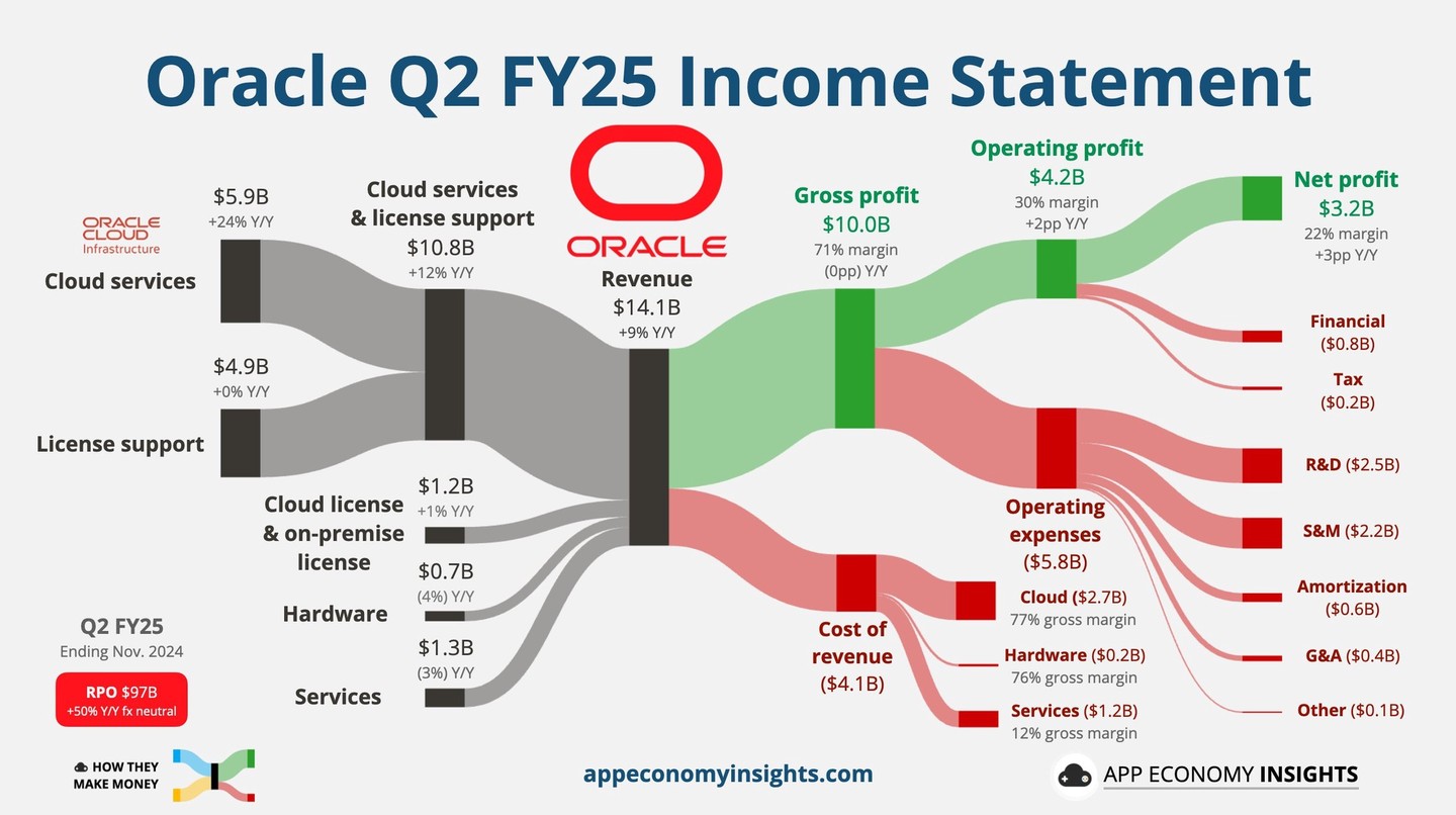美东时间 12 月 9 日周一美股盘后,甲骨文公布截至自然年 2024 年 11 月 30 日的公司 2025 财年第二财季(下称二季度)财务数据,并提供第三财季(下称三季度)的业绩指引。