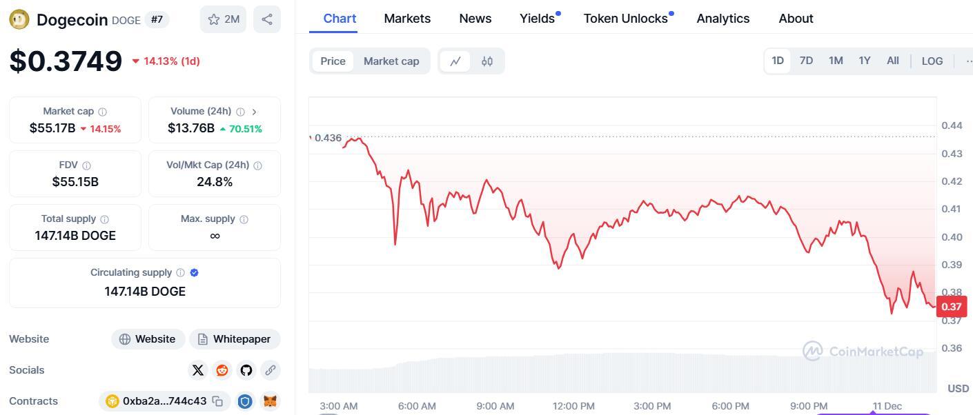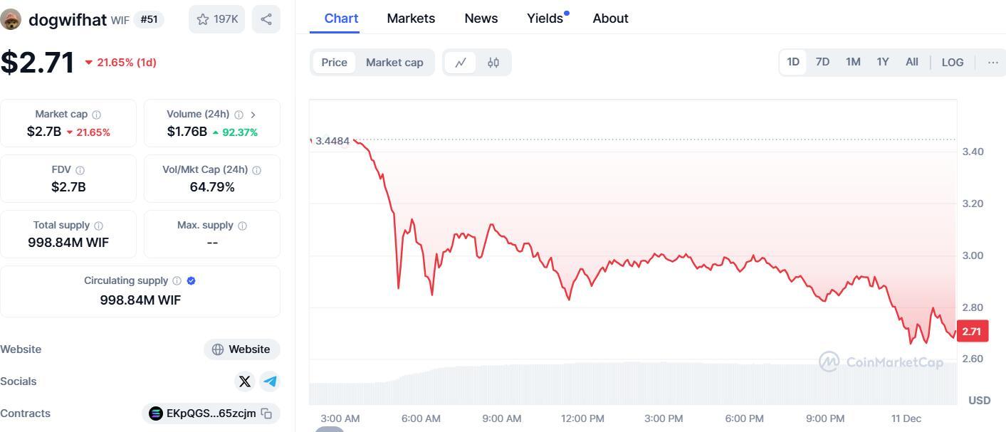 同时,Meme 币盘中跌幅扩大,CoinMarketCap 数据显示,市值在全球加密货币中排名第七位的狗狗币(DOGE)最近 24 小时跌超 14%,市值排在第 51 位的 dogwifhat(WIF)日内跌超 20%。