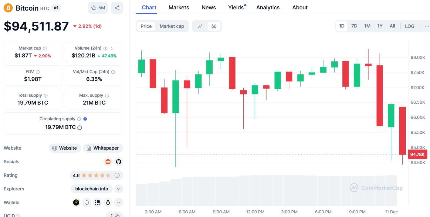 微软股东否决持有比特币的提议后,比特币周二美股盘中重新跌回 9.5 万美元下方。CoinMarketCap 平台数据显示,比特币交易价在美股午盘曾跌破 9.45 万美元,逼近周二亚市盘初刷新的日内低位,较美股早盘 9.82 万美元上方的日内高位跌超 3800 美元、跌近 4%。