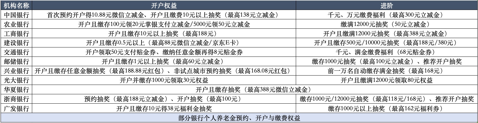 保险经纪人李华(化名)表示,当前手头个人养老金产品对应的各大行都有 “开户羊毛”,“只开户的话,建行是 38 元、工行和光大 50 元;之后看存入金额的大小,还会再有权益。”
