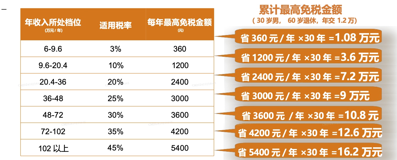 据其提供的测算资料,一位年收入 102 万以上的 30 岁男性,在 60 岁退休前可通过每年满额缴纳个人养老金,节省税收 16.2 万元。