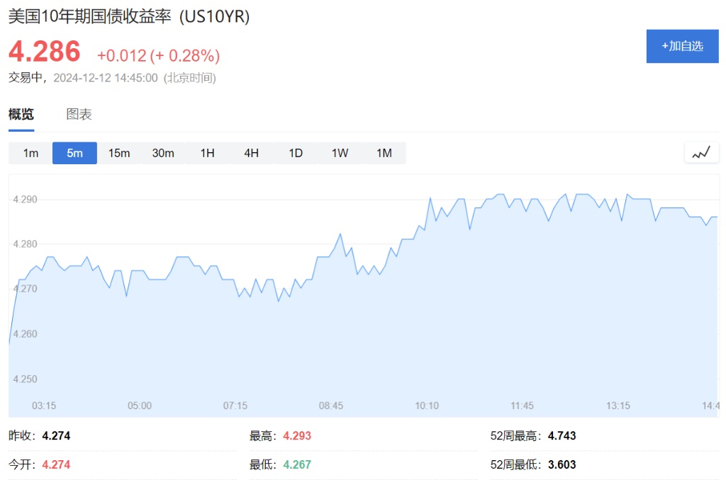 其次,10 年期美债收益率目前仍处于较高水平,截至发稿,报 4.286%。Steinberg 认为,这可能对成长型股票造成压力,并且,特朗普政府可能会造成财政赤字加剧。