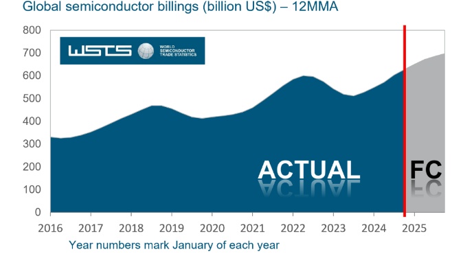 阿利亚领导的美银分析团队还表示,总体而言,预计 2025 年半导体市场的整体销售额将在 2024 年强劲增长的基础上再增长约 15%,达到 7250 亿美元,“这仍然是一个非常强劲的增长步伐,尽管与今年 20% 的预测增长速度相比有所下降。”