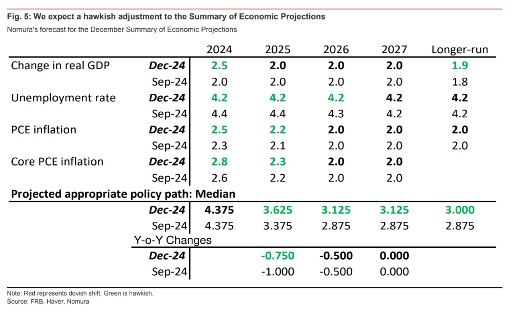 根据野村证券的预测,2024 年核心 PCE 通胀率预测将从 9 月的 2.6% 上调至 2.8%,2025 年为 2.3%(9 月份为 2.2%),与此同时,2025 年的失业率预测从 4.4% 下调至 4.2%。