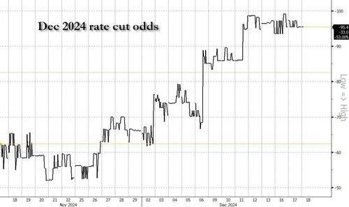 北京时间周四凌晨三点,美联储将公布今年的最后一次利率决议,同时发布最新的点阵图、经济和通胀预测。根据市场定价,降息 25 个基点的概率高达 95%,若符合预期,联邦基金利率目标区间将下调至 4.25%-4.50%。