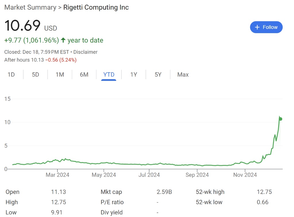 分析师指出,自从谷歌母公司 Alphabet 在 12 月 9 日宣布其在量子计算领域取得突破性进展后,量子计算已经成为交易员们的 “新宠”。像 Rigetti Computing、Quantum Computing 这样的较小的、纯粹的量子计算公司,今年以来股价飙升,Rigetti Computing 已涨超 1000%。