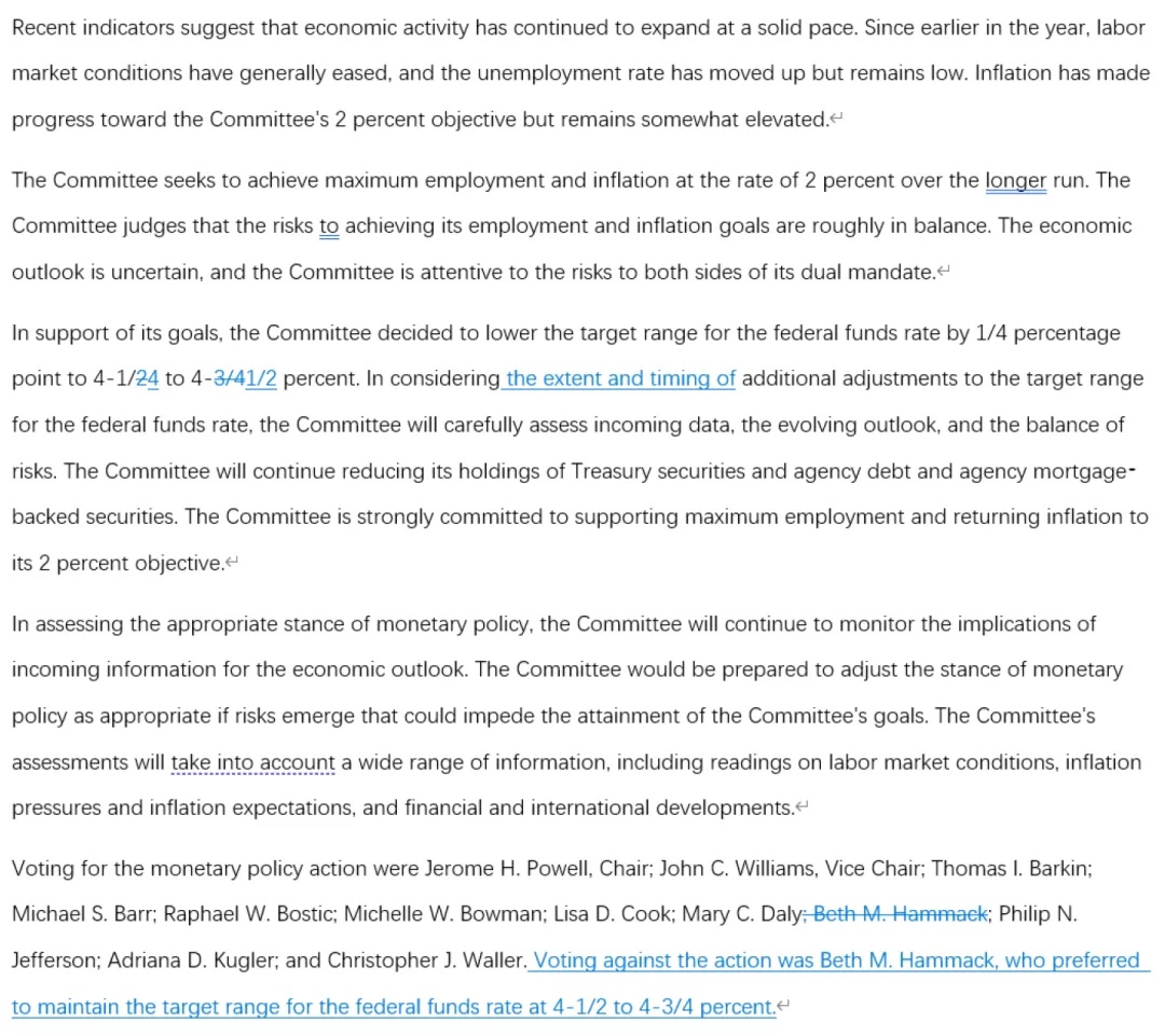 图表 3:美联储货币政策声明对比(2024 年 12 月 vs 2024 年 11 月)