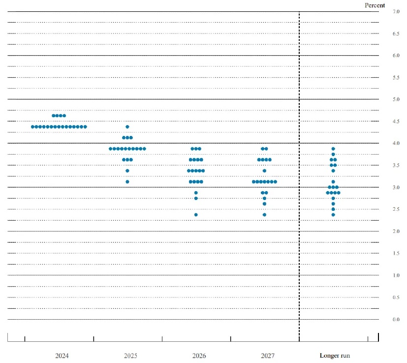 美联储在本次会议如期降息,同时展现了 “鹰派” 姿态。美联储的鹰派体现在三个方面:第一,在最新的预测表中,美联储官员们明显上调了对于 2024 年经济增长的预测,从 9 月预测的 2.0% 上调至 2.5%,对于 2025 年的判断也上调 0.1 个百分点至 2.1%;下调了对于失业率的判断,认为年内失业率将保持在 4.2%,在 2025 和 2026 年,失业率都将稳定在 4.3% 附近;上调了对于通胀与核心通胀的判断,认为 2025 年 PCE 与核心 PCE 都将在 2.5% 左右,高于此前的 2.2%。
