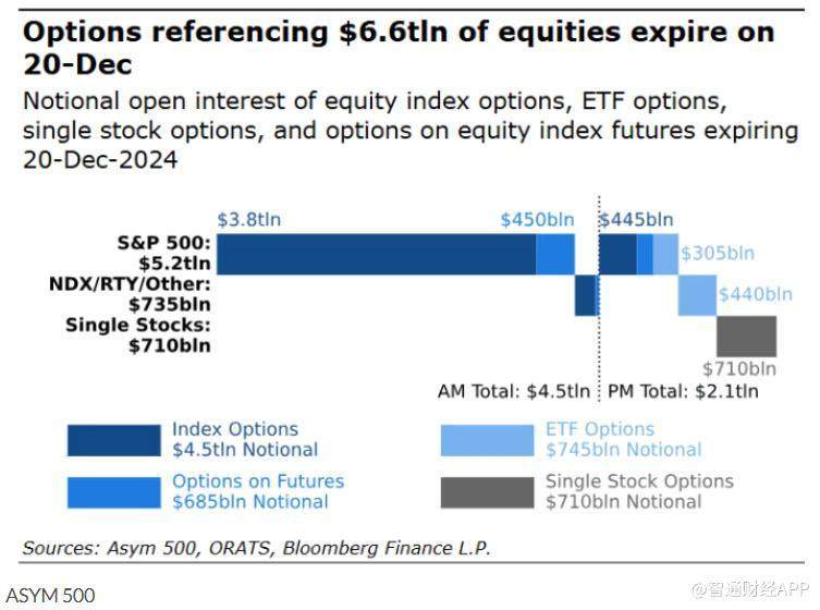 智通财经 APP 获悉,本周五为 “三巫聚首日”(triple witching),预计将成为有史以来规模最大的一次期权到期日。据统计,与股票、交易所交易基金(ETFs)和指数挂钩的期权总额超过 6 万亿美元即将到期。据 Asym 500 提供的数据,具体数字为 6.6 万亿美元,而一些机构甚至估算该名义价值更高,达 7.7 万亿美元。