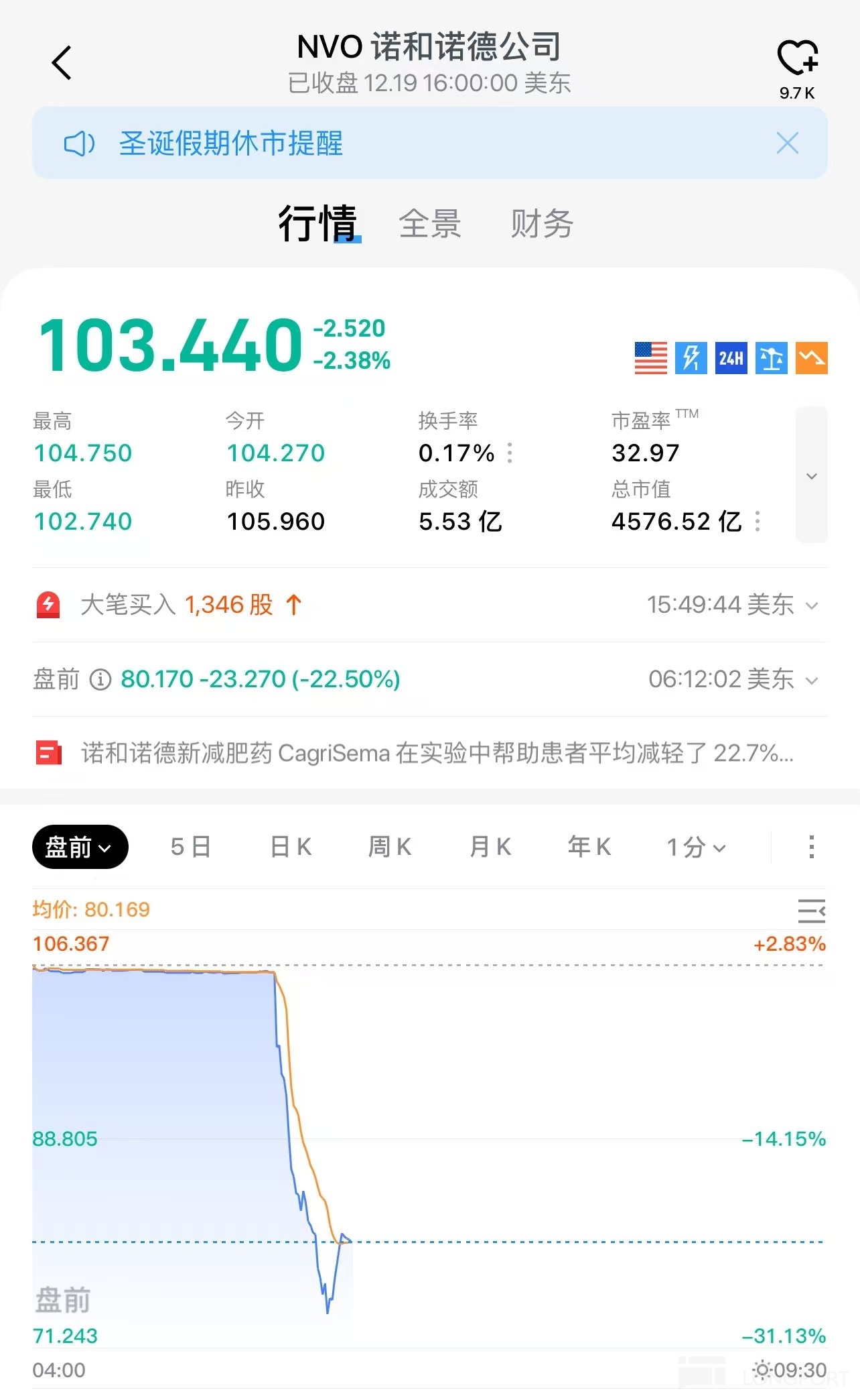 减肥新药不及预期,诺和诺德盘前暴跌近 30%!对手礼来大涨超 10%