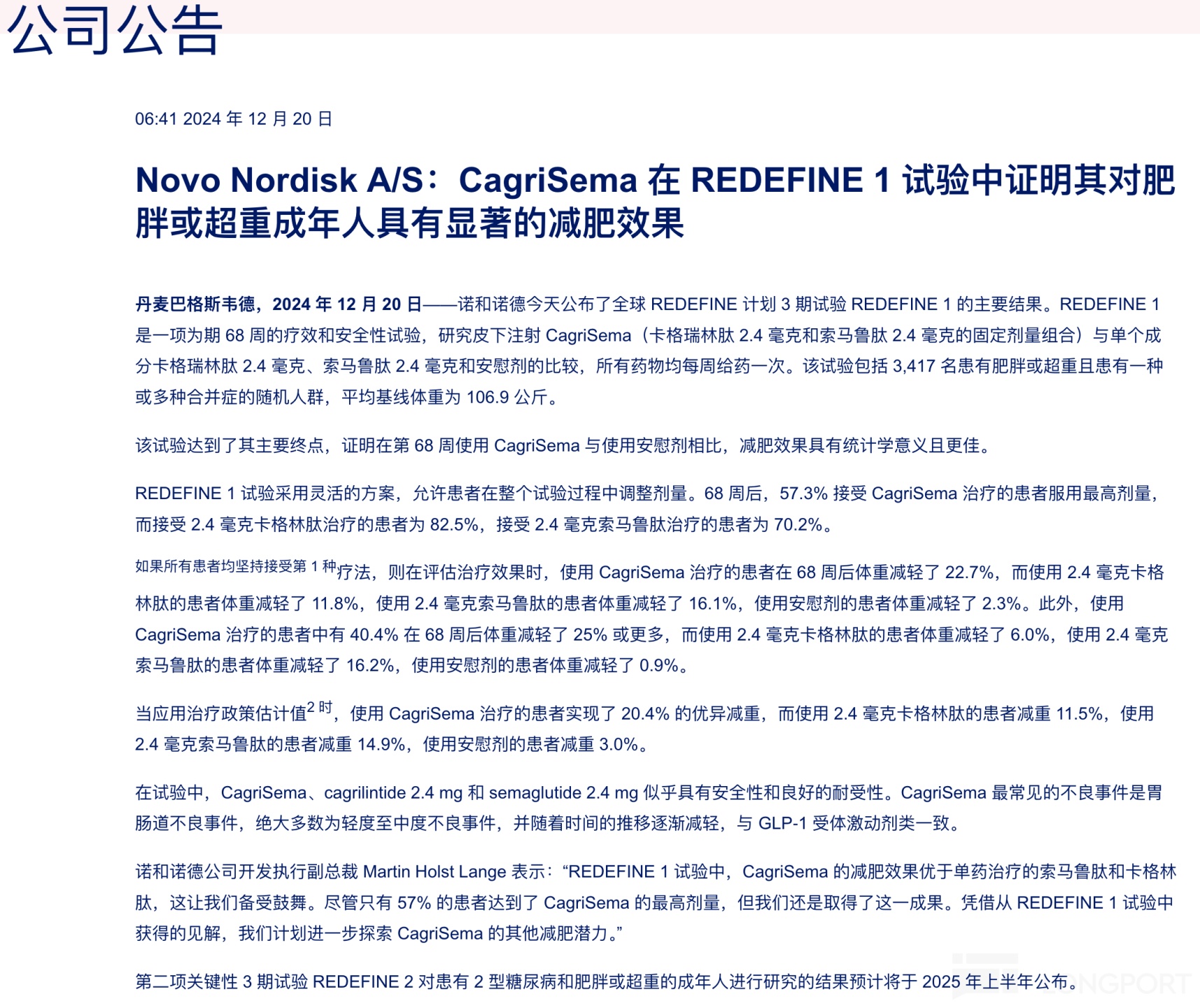 丹麦巴格斯韦德,2024 年 12 月 20 日——诺和诺德今天公布了全球 REDEFINE 计划 3 期试验 REDEFINE 1 的主要结果。REDEFINE 1 是一项为期 68 周的疗效和安全性试验,研究皮下注射 CagriSema(卡格瑞林肽 2.4 毫克和索马鲁肽 2.4 毫克的固定剂量组合)与单个成分卡格瑞林肽 2.4 毫克、索马鲁肽 2.4 毫克和安慰剂的比较,所有药物均每周给药一次。该试验包括 3,417 名患有肥胖或超重且患有一种或多种合并症的随机人群,平均基线体重为 106.9 公斤。