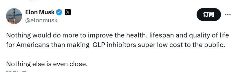 马斯克 2022 年就曾高调承认服用 Ozempic。他主张广泛使用 GLP-1 药物治疗肥胖症。本月稍早,他曾在 X 发帖称:“对公众来说,没有什么能比让 GLP 激动剂的成本极低更能改善美国人的健康、延长寿命、提高生活质量。没有什么东西能与之媲美。”