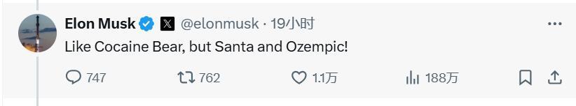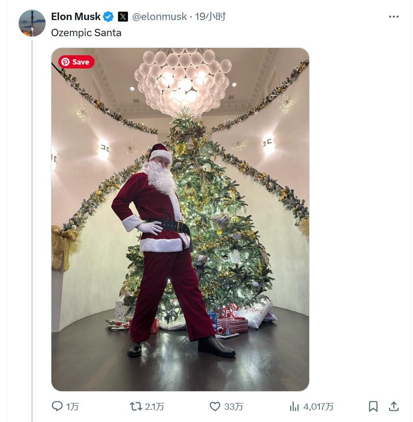 搭配照片,马斯克发帖写道自称是 “Ozempic 圣诞老人”,Ozempic 是诺和诺德明星减肥药司美格鲁肽注射液的品牌名,用这个词修饰圣诞老人无疑让人联想到马斯克是在说,他这个瘦身版圣诞老人是接受了司美格鲁肽注射的减肥效果。