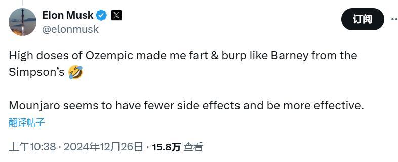 本周三,在被网友问到为何服用 Mounjaro 时,马斯克还主动将 Mounjaro 和 Ozempic 做了对比,变相给 Mounjaro 打了广告。他回复网友称,“高剂量” 的 Ozempic 药物会让他像《辛普森一家》中的角色巴尼一样放屁和打嗝,“Mounjaro 似乎副作用更少,而且更有效。”