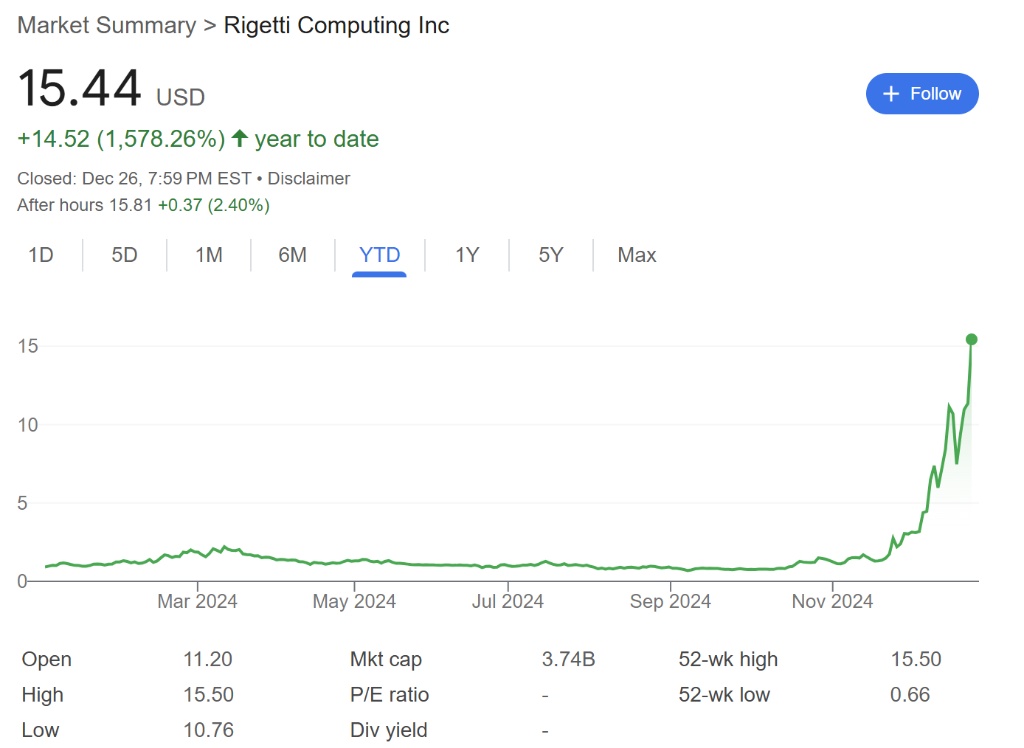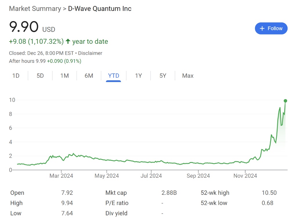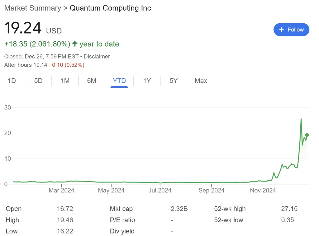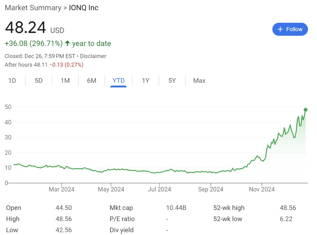 IONQ 正在开发硬件和软件解决方案,旨在令量子计算在现实应用中变得可行,其核心技术是基于离子阱的量子计算,在处理复杂计算任务时优势明显。在 2024 年最后一个月,IONQ 股价上涨了 52%,与同行相比涨幅相当温和,今年迄今为止,IONQ 上涨近 300%。