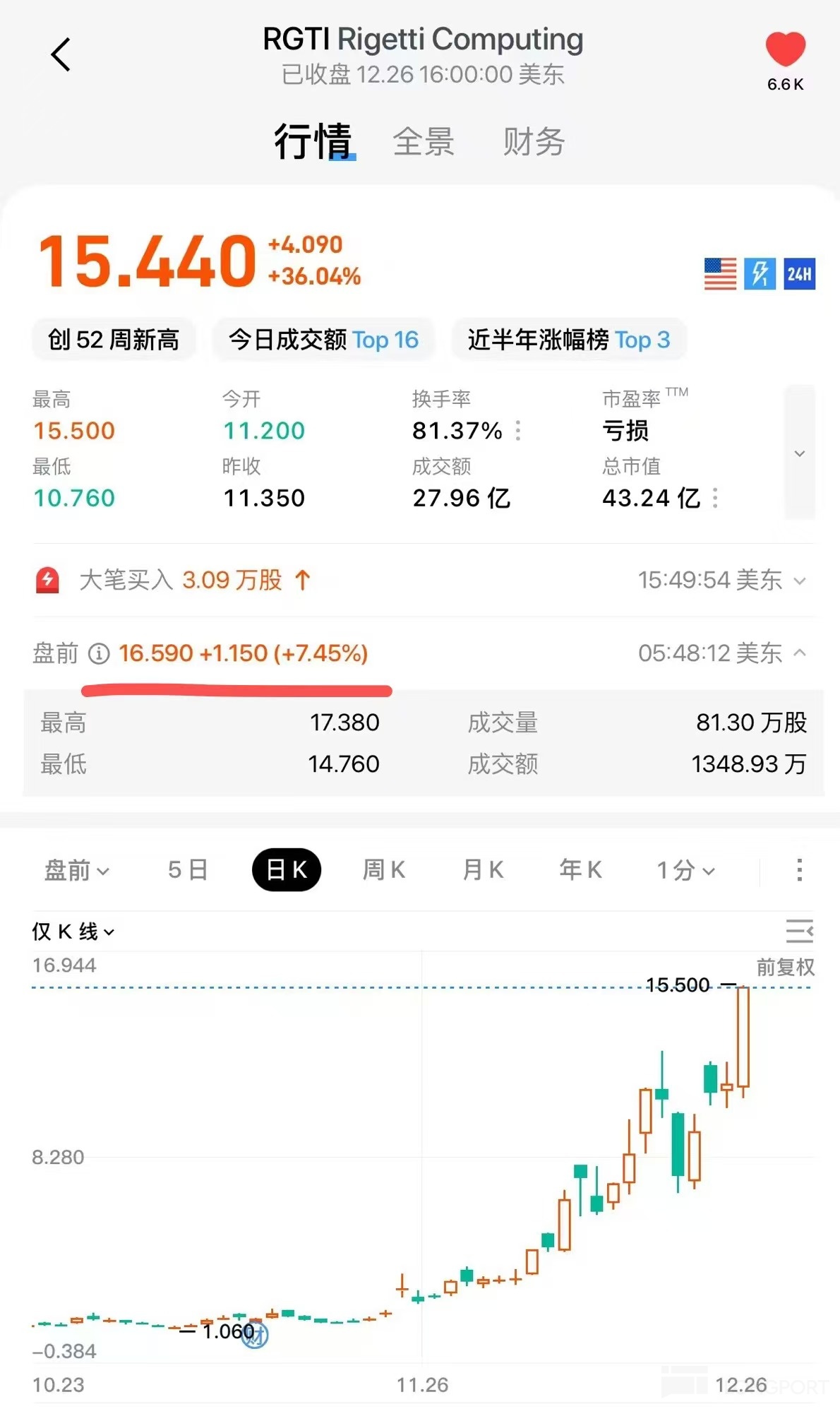 龙头之一 RGTI 在隔夜暴涨之后,今日盘前继续涨超 7%: