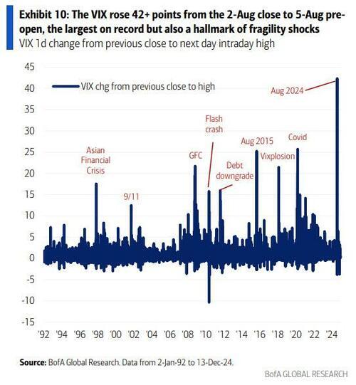 美银认为,今年 8 月 5 日的 VIX 指数冲击是一个危险信号,市场脆弱性根基尚存。