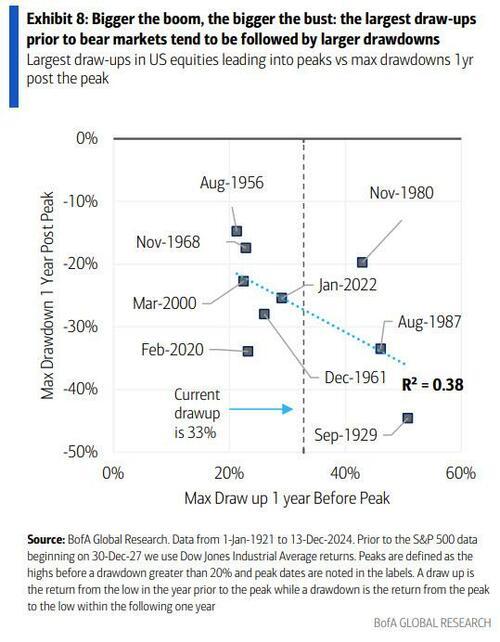 美银指出,标普 500 指数有望连续两年上涨 20% 以上,目前上行势头似乎仍将保持强劲。不过最近,标普 500 指数的预期市盈率已超过 25,处于历史高位。历史数据也表明,这样的繁荣过后往往伴随的是萧条。