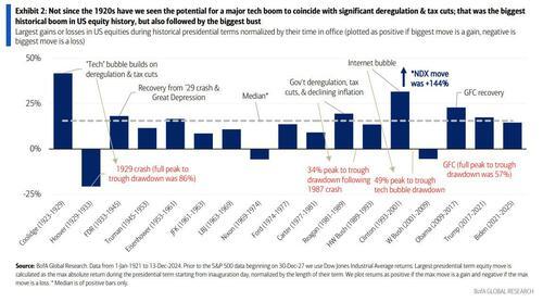 美银认为,特朗普 2.0 的政策与人工智能革命相遇创下了自咆哮的 2020 年代以来从未出现过的新景象,不过虽然这种结合会助长繁荣,但同时也会放大 2025 年的 “右尾风险”,且可能比许多人预期的还要大。