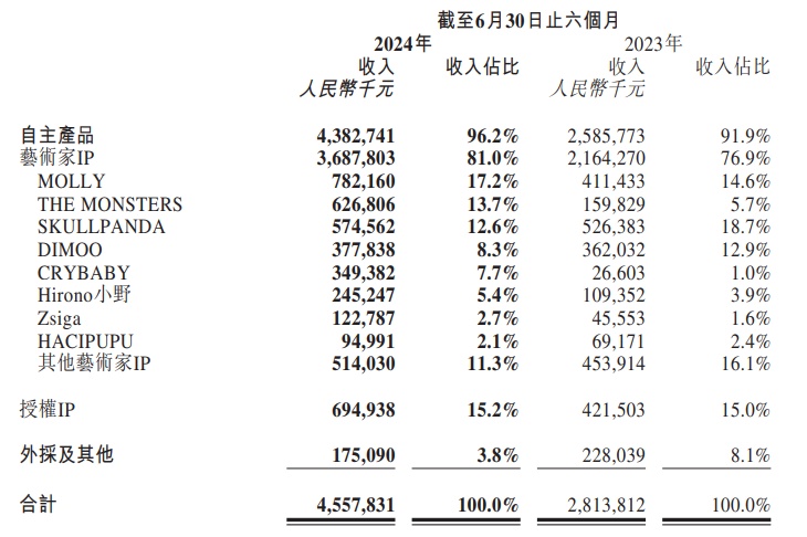 在 2024 年上半年中,Molly、The Monster、Skullpanda、Dimoo、Crybaby、Hirono、Zsiga、Hacipupu 这八个 IP 分别为泡泡玛特贡献了 7.82 亿元、6.27 亿元、5.75 亿元、3.78 亿元、3.49 亿元、2.45 亿元、1.23 亿元、0.95 的收入,分别占泡泡玛特同期收入的 17.2%、13.7%、12.6%、8.3%、7.7%、5.4%、2.7%、2.1%,合计 69.7%。