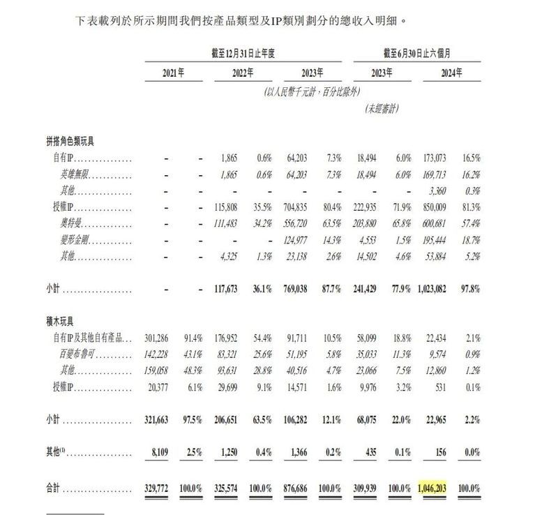 招股书显示,IP 授权费用在布鲁可的成本中占比逐年提升,从 2022 年的 7.3% 上涨到 2024 年上半年的 18.5%。