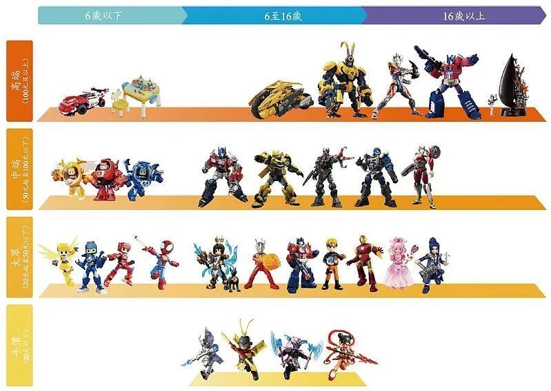 它跳出此前 1-6 岁的年龄段,扩大用户群体,陆续发布了奥特曼、变形金刚、英雄无限等 IP 的积木人盲盒以及手办。区别于市面常见的 4.5 厘米和 15 厘米积木人,布鲁可首创了 10 厘米尺寸,方便手握,且 14 处可动、眼睛发光,更加还原 IP 的人物细节。