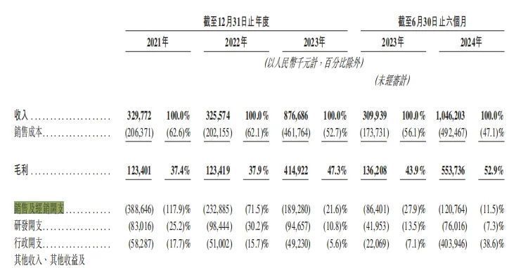 这让它得以在控制销售成本的前提下,获得收入的快速增长。2021 年,卖积木的布鲁可经销和销售开支高达 3.89 亿元,比同期 3.3 亿元的收入金额还高。到 2024 年上半年,卖盲盒的布鲁可已经把这项成本降到 1.2 亿元,仅占同期收入(10.46 亿元)的 11.54%。