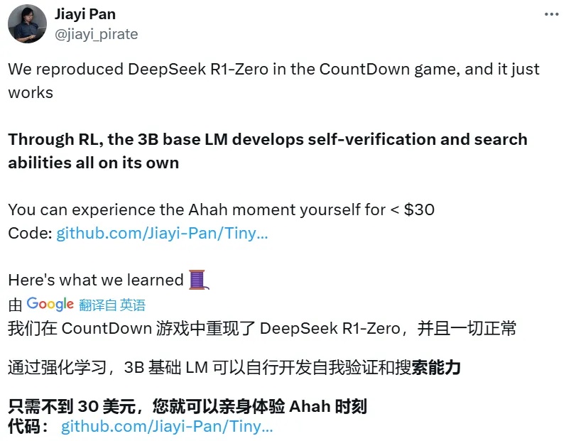TinyZero 则是一个尝试复现 DeepSeek-R1-Zero 的项目,据其作者、伯克利 AI 研究所在读博士潘家怡(Jiayi Pan)介绍,该项目是基于 CountDown 游戏实现的,完整配方有一句话就能说完:「遵照 DeepSeek R1-Zero 的算法 —— 一个基础语言模型、提示词和 ground-truth 奖励,然后运行强化学习。」