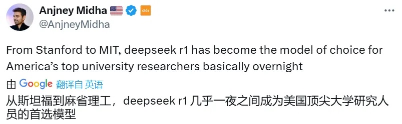 毕竟,正如 a16z 合伙人、Mistral 董事会成员 Anjney Midha 说的那样:从斯坦福到麻省理工,DeepSeek-R1 几乎一夜之间就成了美国顶尖大学研究人员的首选模型。