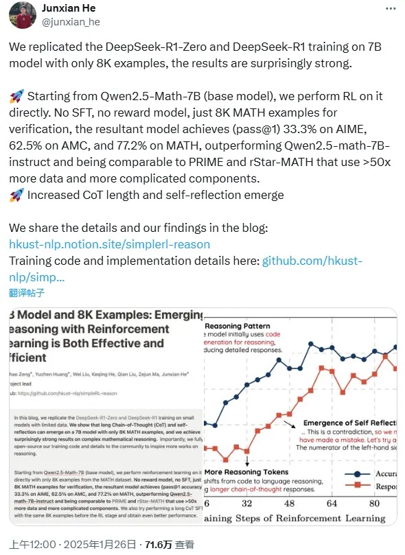 另一个复现 R1 的团队是来自香港科技大学的何俊贤(Junxian He)团队,并且他们采用的基础模型和样本量都非常小:基于 7B 模型,仅使用 8K 样本示例,但得到的结果却「惊人地强劲」。