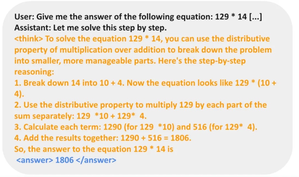 模型的推理行为严重取决于具体任务。对于 CountDown 游戏,模型会学习执行搜索和自我验证;对于数值乘法,模型会学习使用分配律分解问题并逐步解决。