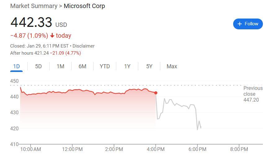 财报公布后,收跌超 1% 的微软股价盘后跳水,盘后跌超 5% 后收窄过半跌幅,曾跌不足 1%,后跌幅再度扩大,一度跌超 6%。