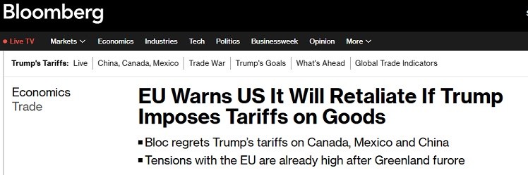 据新华社,欧盟委员会发言人 2 日说,欧盟对美国决定对进口自加拿大、墨西哥和中国的商品加征关税表示遗憾。关税会造成不必要的经济混乱并推动通货膨胀,这对各方都是有害的。