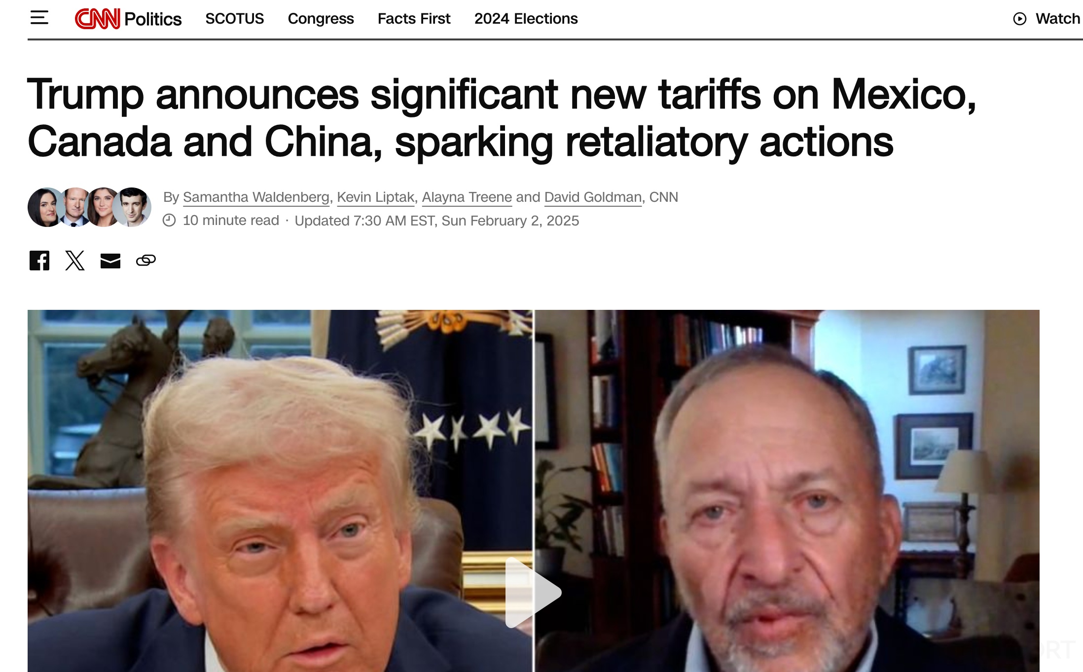 当地时间 2 月 1 日,美国政府宣布,对来自加拿大和墨西哥的进口商品征收 25% 的关税。