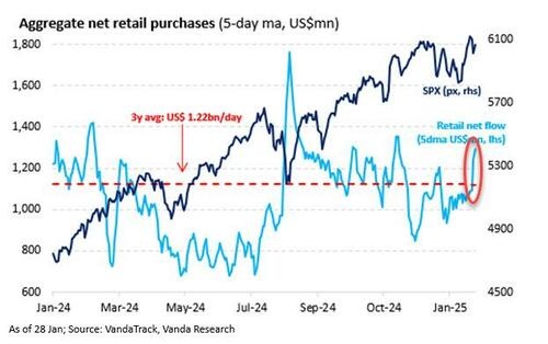 Vanda Research 的数据也显示,在 DeepSeek 冲击引发的股市下跌后,散户在一周内向美国股票和 ETF 市场共注入了约 42.5 亿美元新资金。其中,周一单日流入资金高达 18.5 亿美元,5 天日均流入达到 13 亿美元,为 2024 年美国大选左右以来的最高水平。