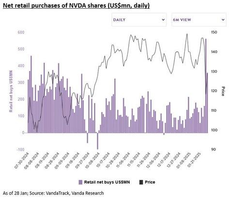 美股遭 DeepSeek 冲击后,散户一周内向美国股票和 ETF 市场共注入了约 42.5 亿美元新资金,上周五到本周二,散户对英伟达的净买入总额已超过 10 亿美元,但与此同时,机构却在大举抛售,本周二净卖出 40 亿美元的股票。