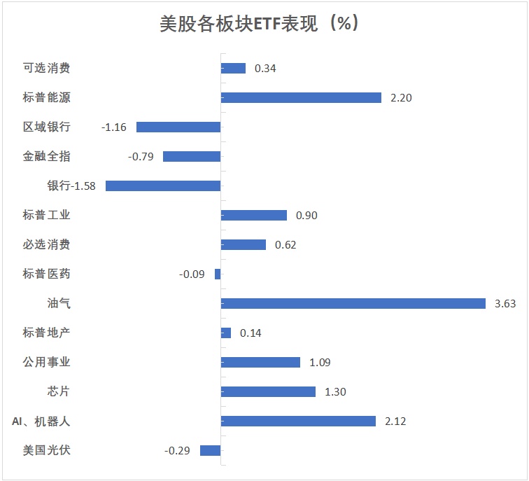 美股行业 ETF 涨多跌少。能源业 ETF 收涨 2.2%,半导体 ETF 涨 1.89%,全球科技股指数 ETF、科技行业 ETF 至少涨超 1.4%,网络股指数 ETF 涨幅不足 1.0%,可选消费 ETF 涨超 0.4%,金融业 ETF 则收跌将近 0.8%,银行业 ETF 跌 1.08%,区域银行 ETF 跌 1.16%,全球航空业 ETF 跌 1.21%,生物科技指数 ETF 跌 1.33%。