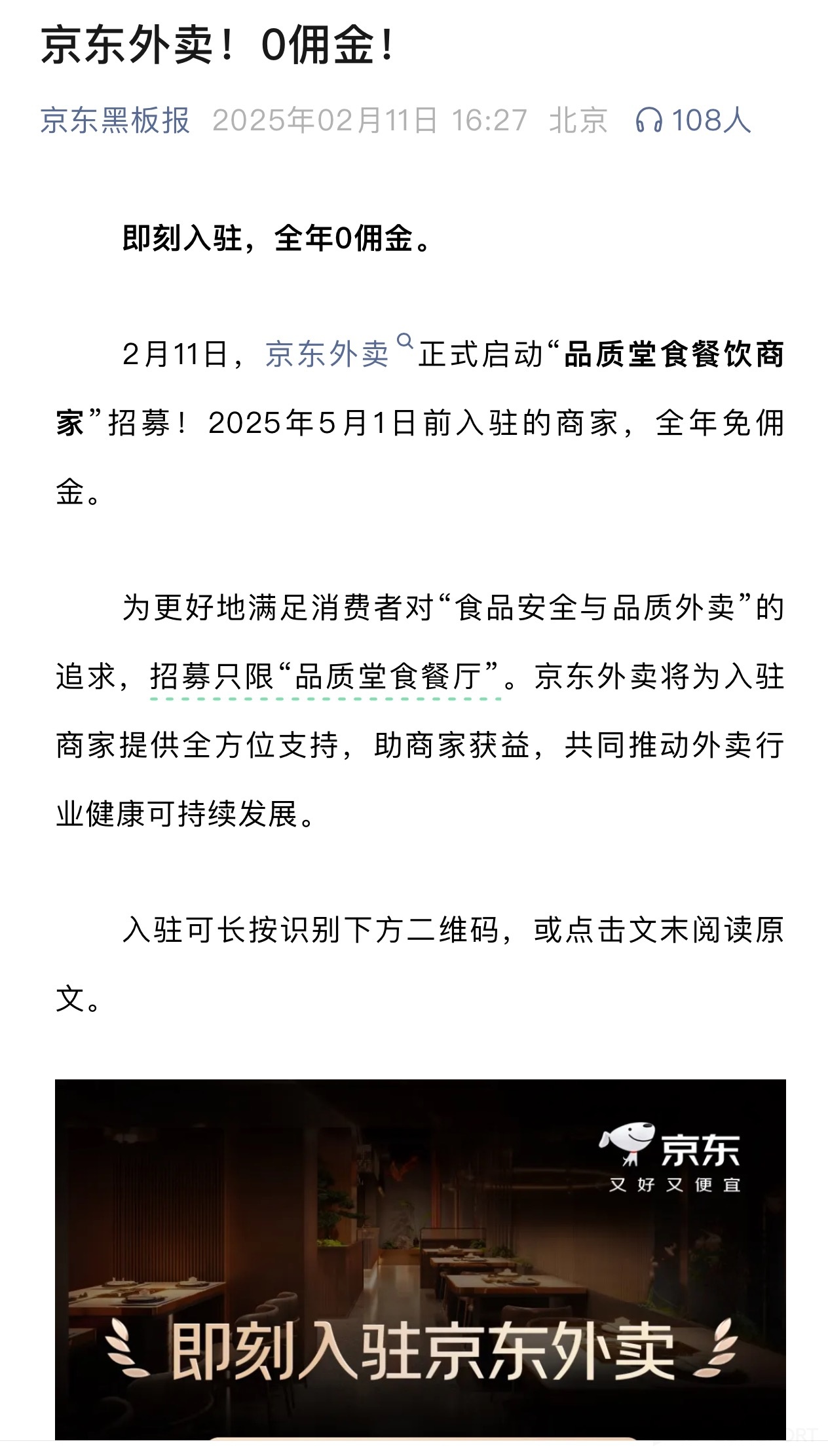 2 月 11 日港股收盘后,京东旗下微信公众号京东黑板报宣布,京东外卖正式启动 “品质堂食餐饮商家” 招募,2025 年 5 月 1 日前入驻的商家,全年免佣金。