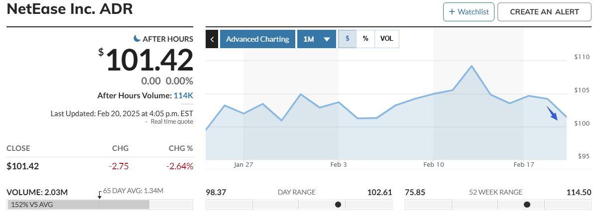 财报公布后,在美上市的中概股网易周四追随美股大盘下跌,股价连续第二日回落,收跌约 2.6%,刷新 2 月 5 日以来收盘低位。