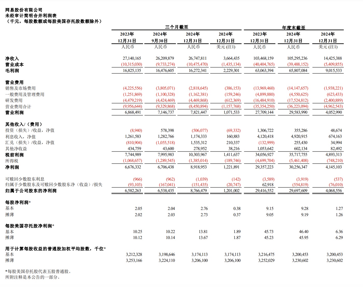 2 月 20 日周四,网易发布 2024 年第四季度及全年财务数据。