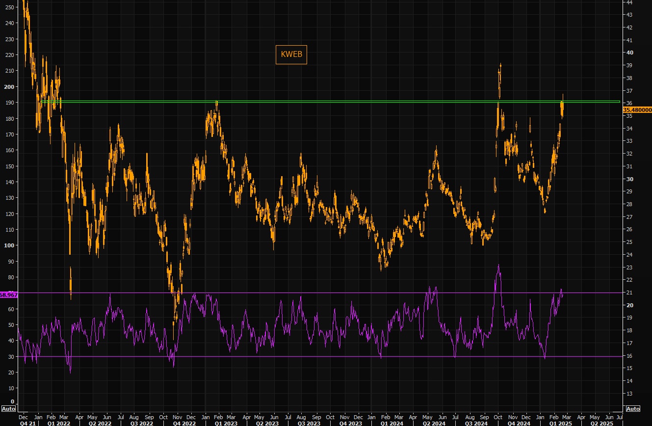 隔夜阿里、B 站财报利好之下,中概科技股代表 ETF KWEB(黄线)继续走高,较一月低点已经涨超 30%,其 RSI(紫线)处于严重超买领域。