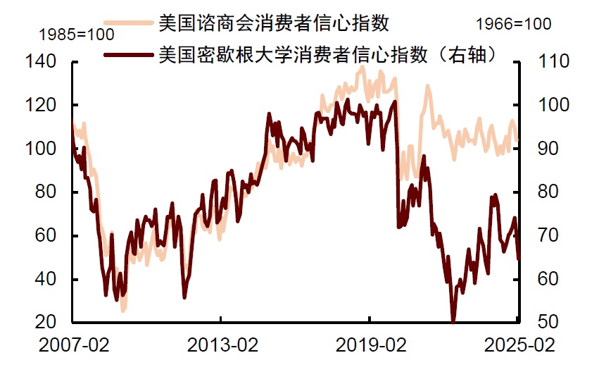 关税的不确定性或降低消费者和企业信心,对其决策造成干扰。一方面,关税推高消费者通胀预期,抑制对未来购买力的预期。2 月密歇根大学调查显示,消费者对未来一年的通胀预期高达 4.3%,对未来 5-10 年的通胀预期上升至 3.5%[5]。这表明,消费者对关税的上调会推动物价上涨有普遍担忧。