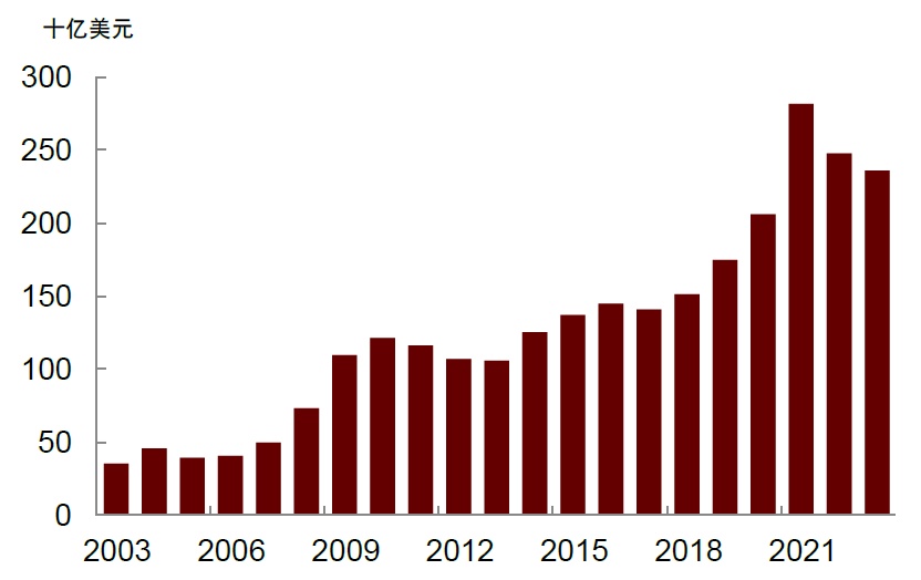 其次,DOGE 对政府不当支付的审查范围扩大,强制性支出也将遭到削减。不当支付是指各联邦部门的错误或可疑支付,包括浪费、欺诈和腐败问题。根据美国政府问责局(GAO)的数据,新冠疫情以来美国政府的不当支付规模较高,2023 财年共有约 2350 亿美元的不当支付(图表 6)。