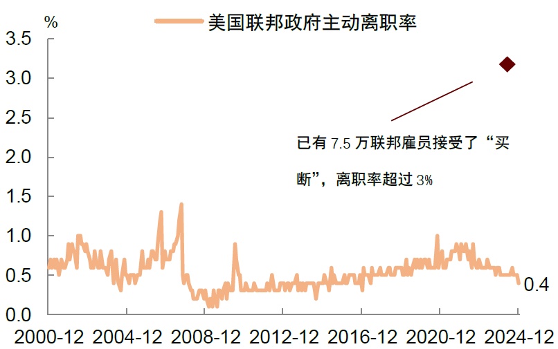 数据显示 [11],到目前为止约有 7.5 万名联邦雇员接受了买断计划,占整个联邦雇员的比例超过 3%,而 3% 的买断率也远远超过了常态时期美国联邦政府雇员 0.4% 的主动离职率(图表 5)。根据 DOGE 的计划,最终的联邦政府裁员比例或在 5%-10% 左右,这意味着最终或有 10-20 万联邦雇员被迫换工作。